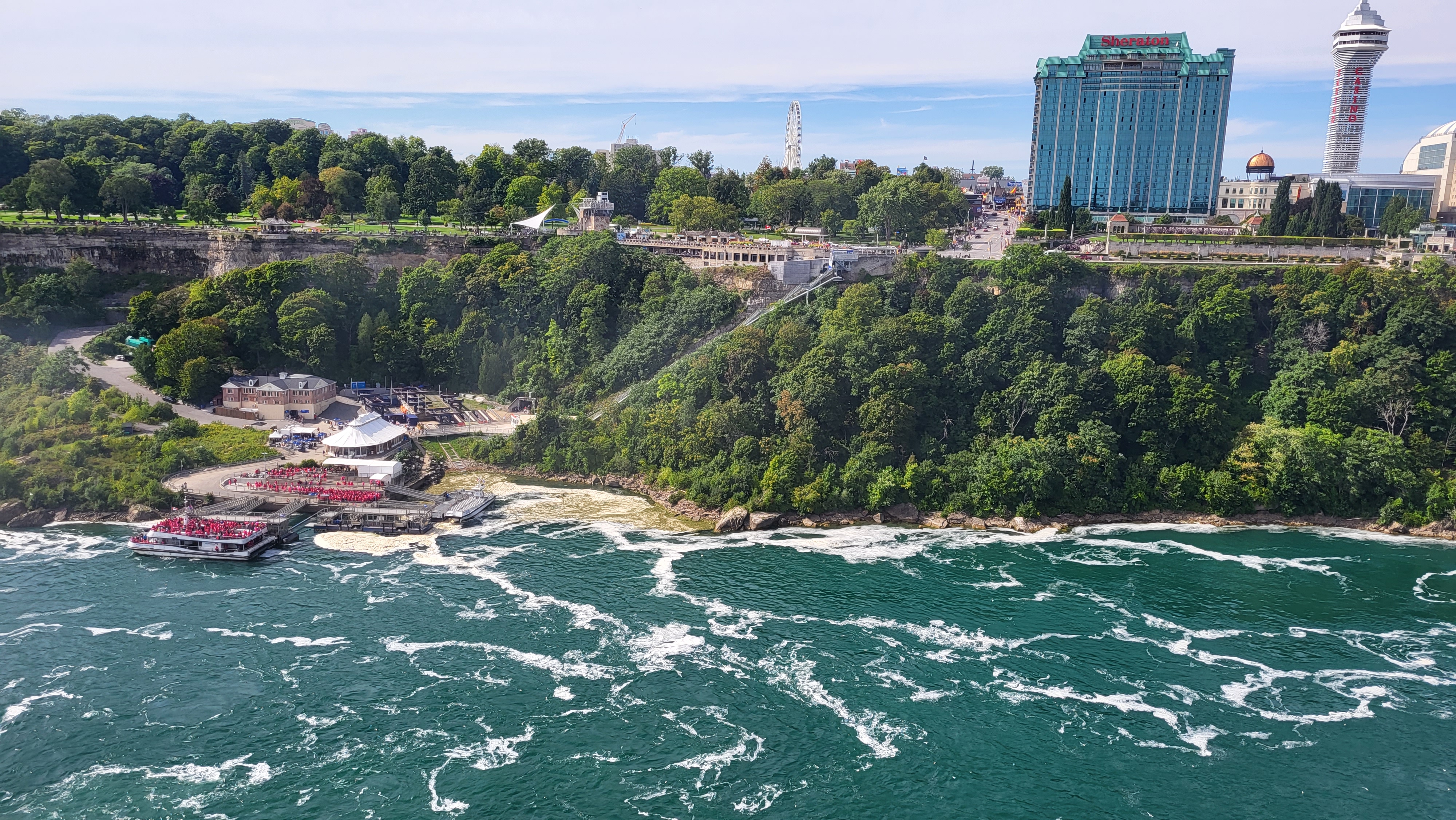 From the New York side, you can clearly see Canada across the river, with boats moving in and out on both sides.